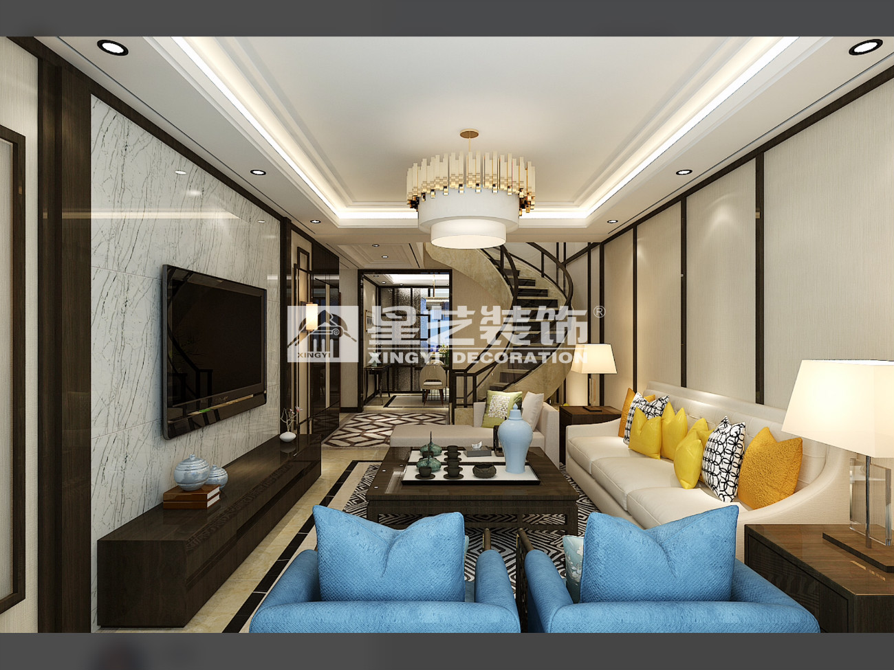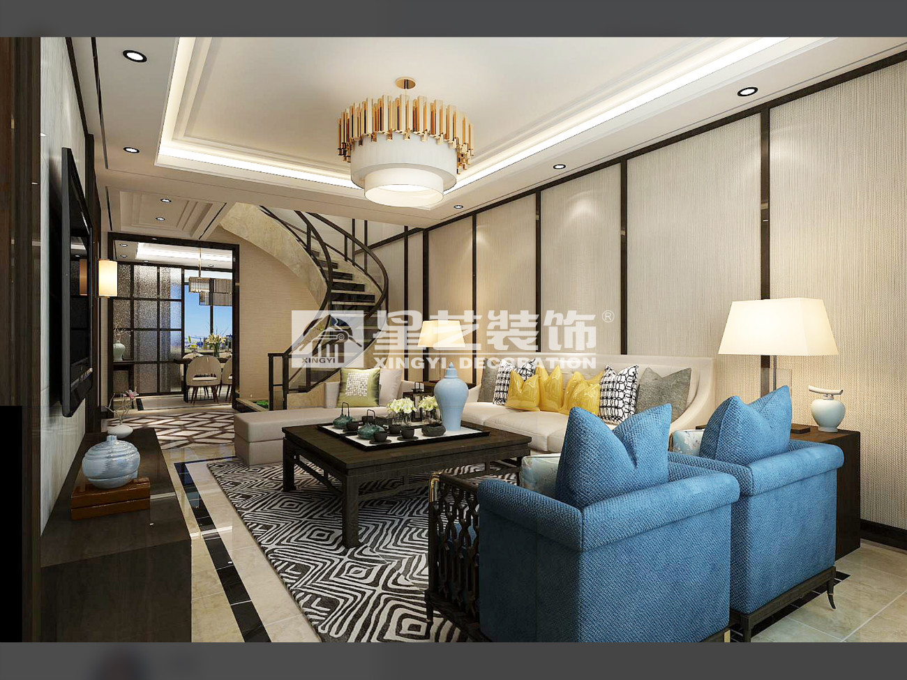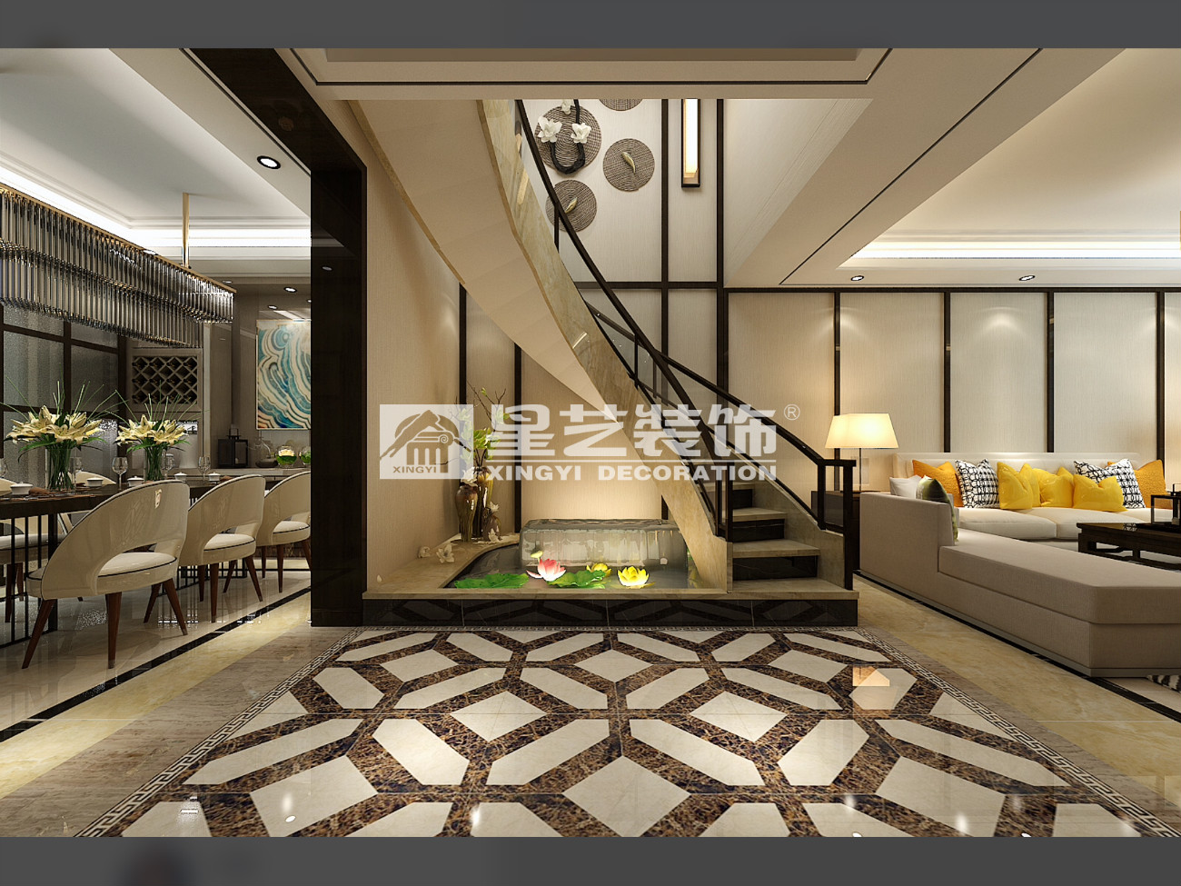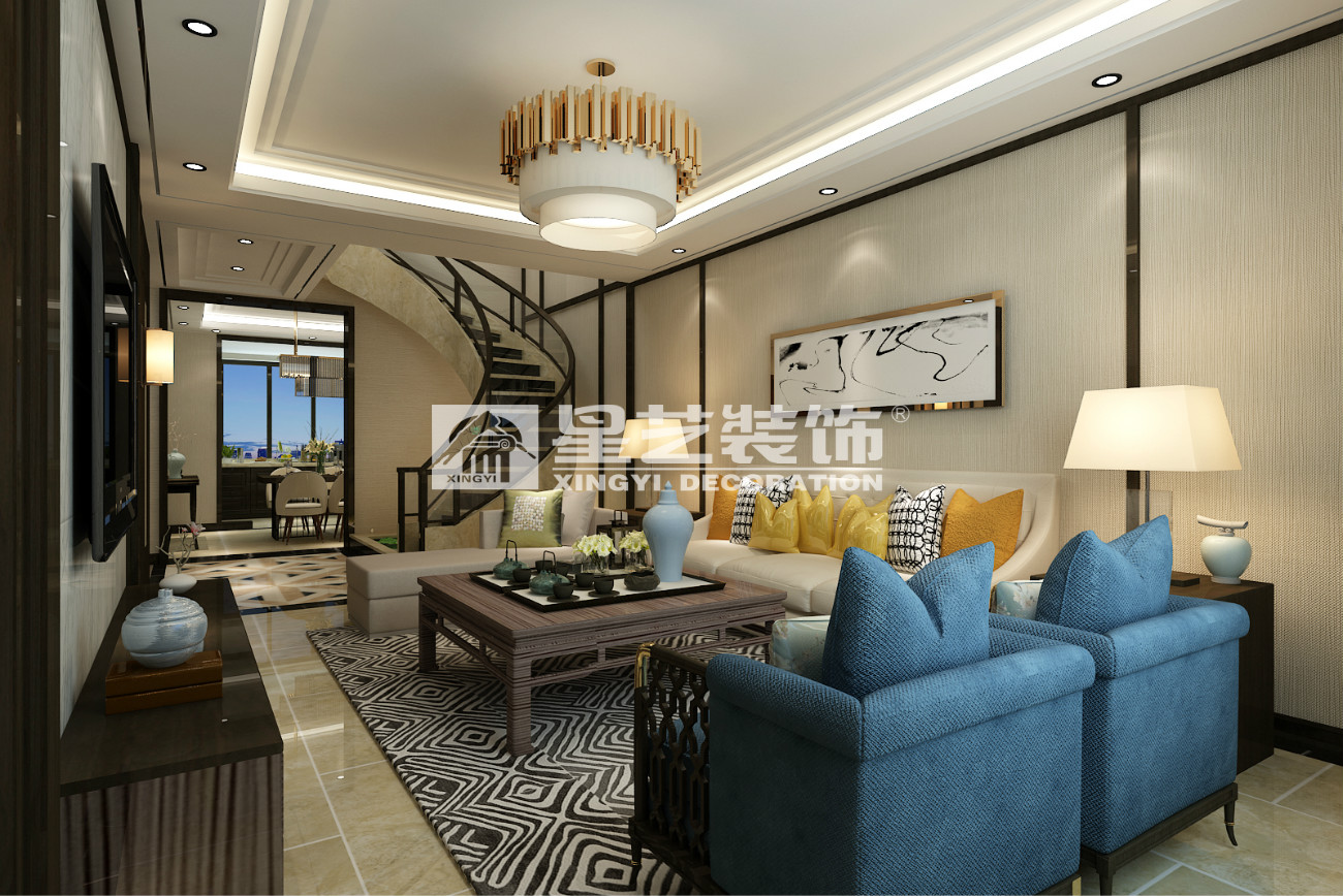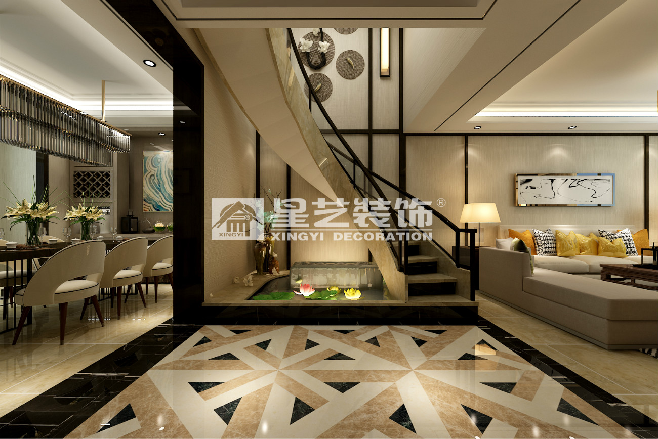本案為復式結構,樓梯作為承上啟下的重要角色,自然少不了他的亮點,弧形玻璃樓梯,于石材自然的交融,展現的時尚大氣,作為入戶主視角,自然少不了現代中式的元素和飾品。