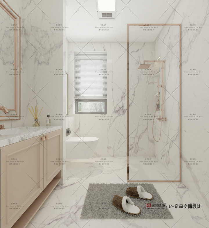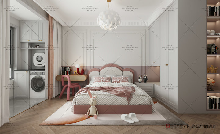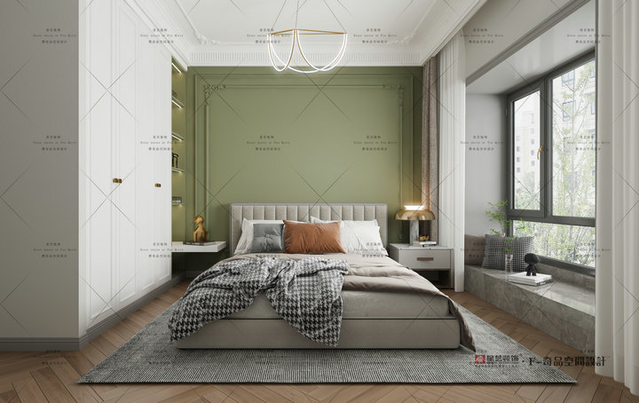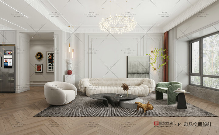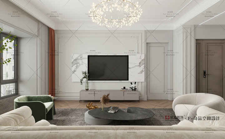 設計說明:法式風格的優雅、浪漫、宮廷感深入人心、經久不衰,與現代時尚的輕奢風相遇后,則凝結成一種文藝典雅、與眾不同的空間意境.