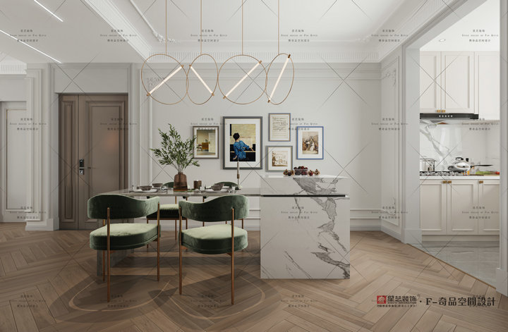 天然紋理的石材島臺,造型上與背景墻線條元素相呼應,更具視覺延伸感,為生活增添了儀式感。陳設的三兩組軟裝使空間靈動而優雅,隨性打開的書本恰好點亮了室內的文藝氛圍。仿佛還原了與家人聊天、品茶、閱讀的生活情境,在空間藝術韻律的熏陶下,演繹極具個性的法式輕奢風情。