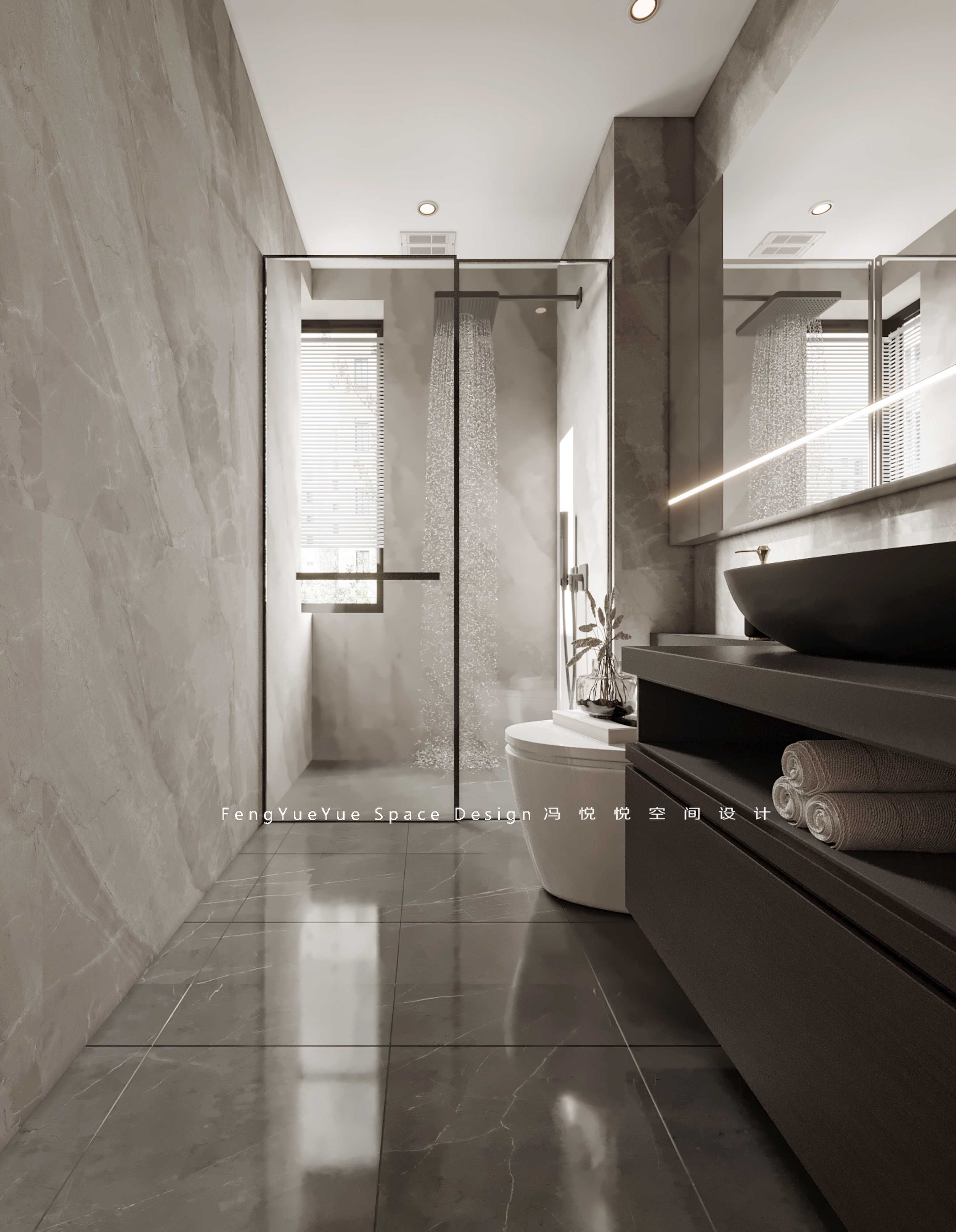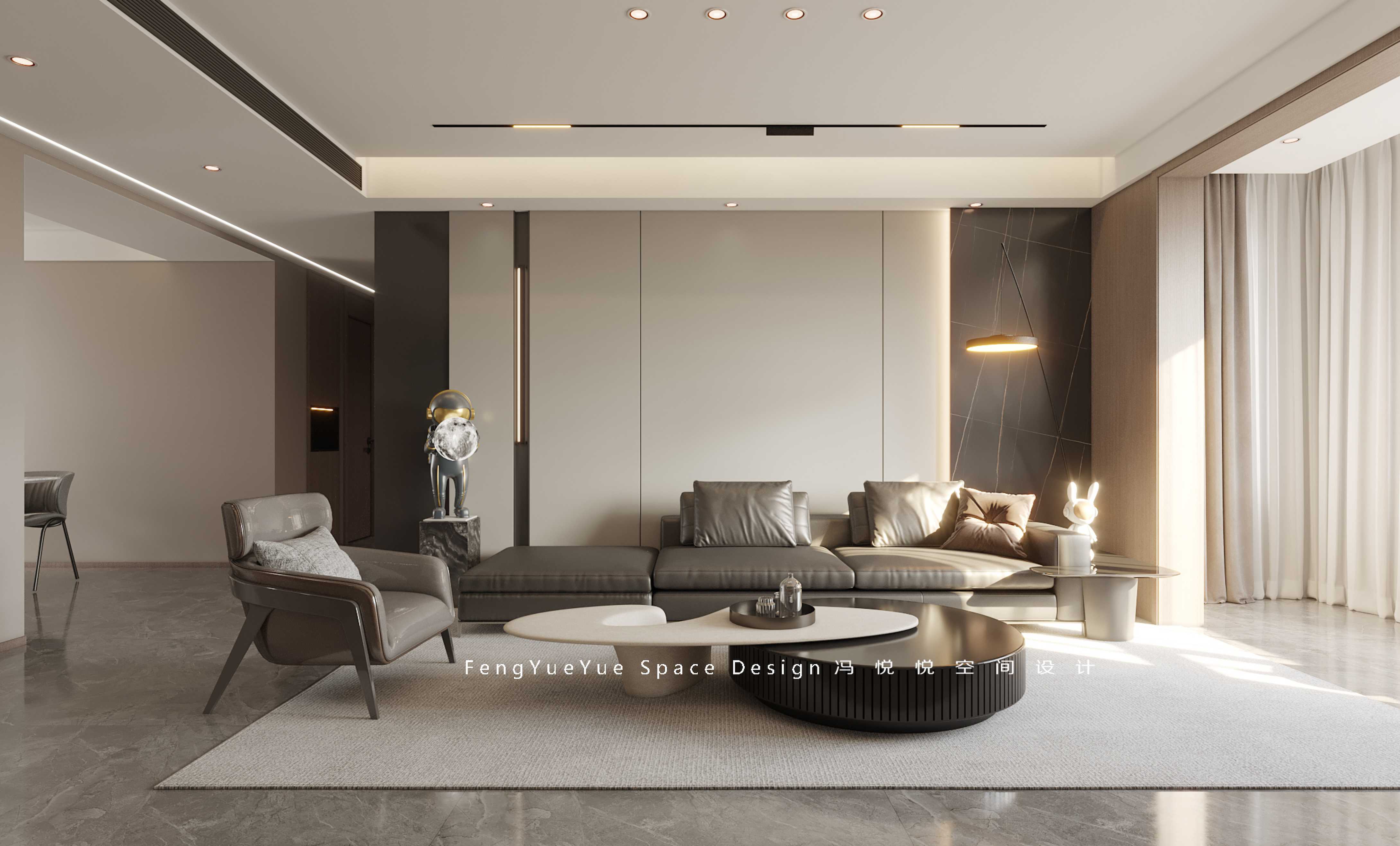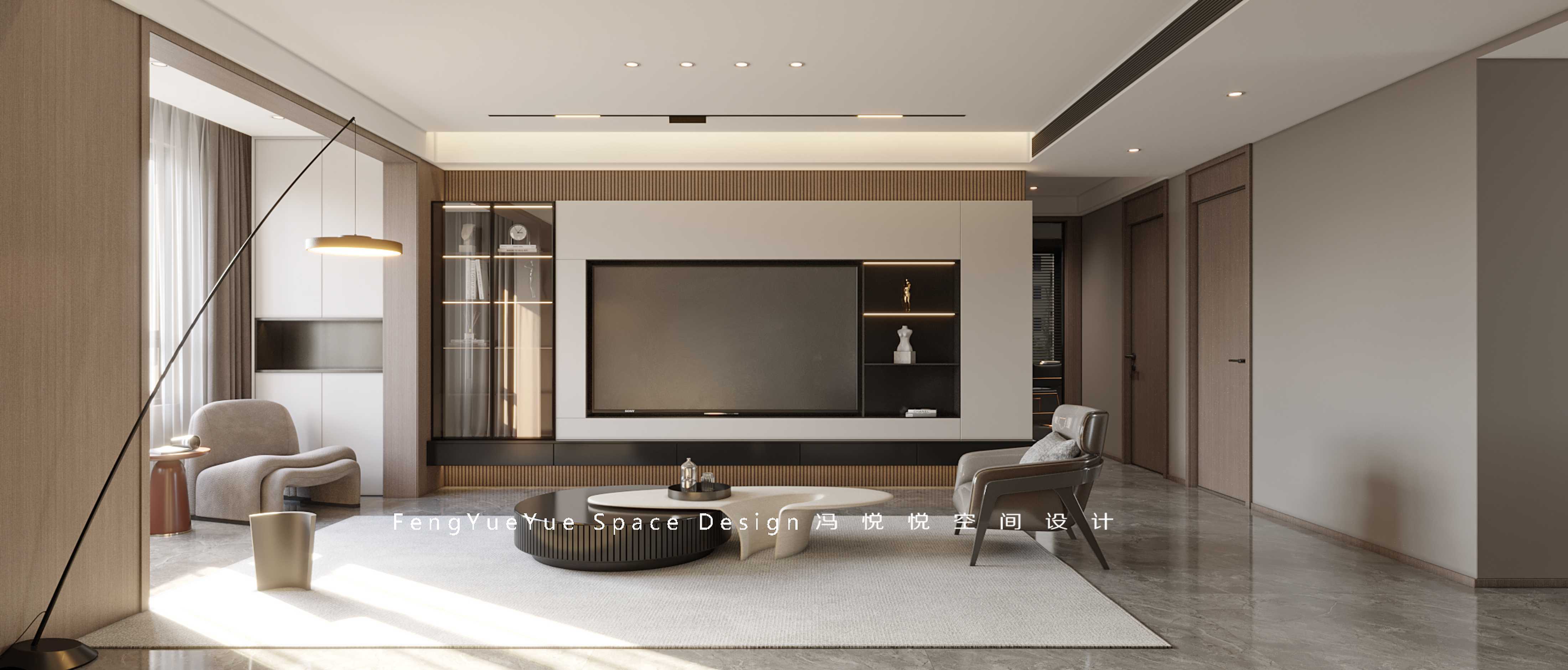 客廳選擇采用無主燈設計,拉伸客廳空間,磁吸軌道燈與落地燈光影,搭配極簡沙發相得益彰,呈現意式的優雅低調的美感~嵌入電視背景墻,自然紋理巖板搭配木格柵,設立多種規格層板,開放區域擺放的手辦、收藏品,彰顯出主人的高品位