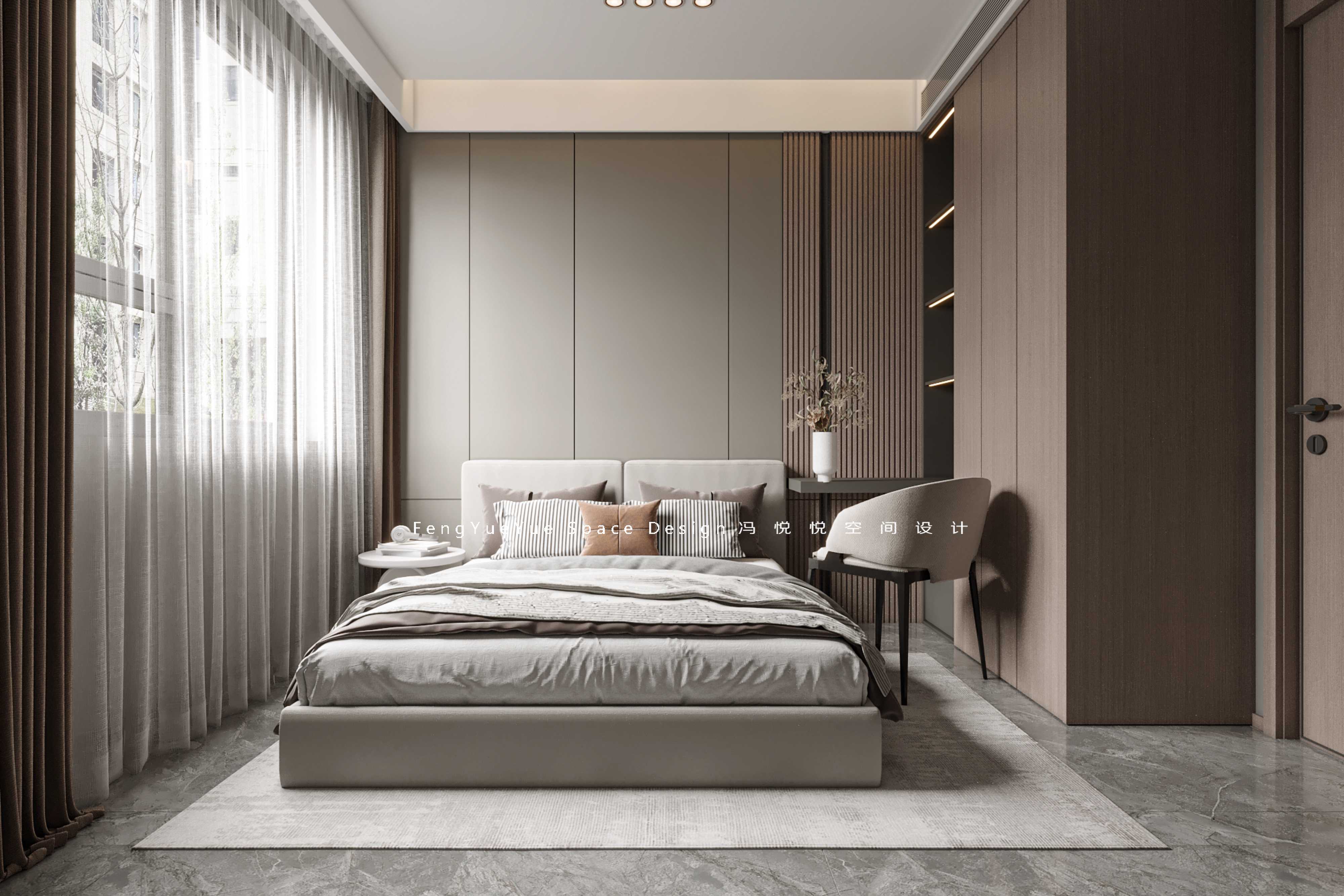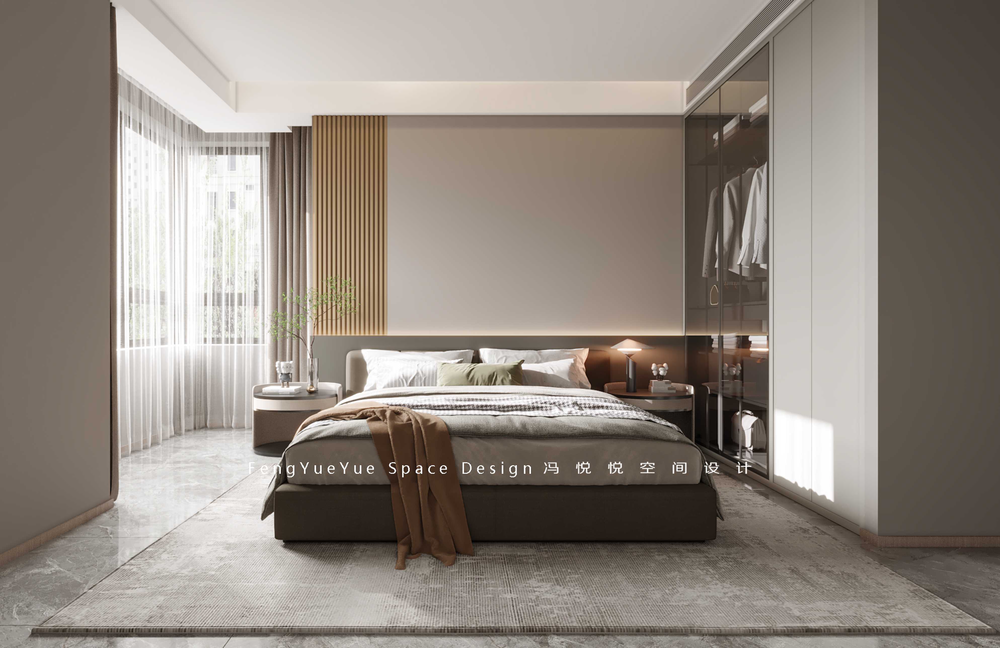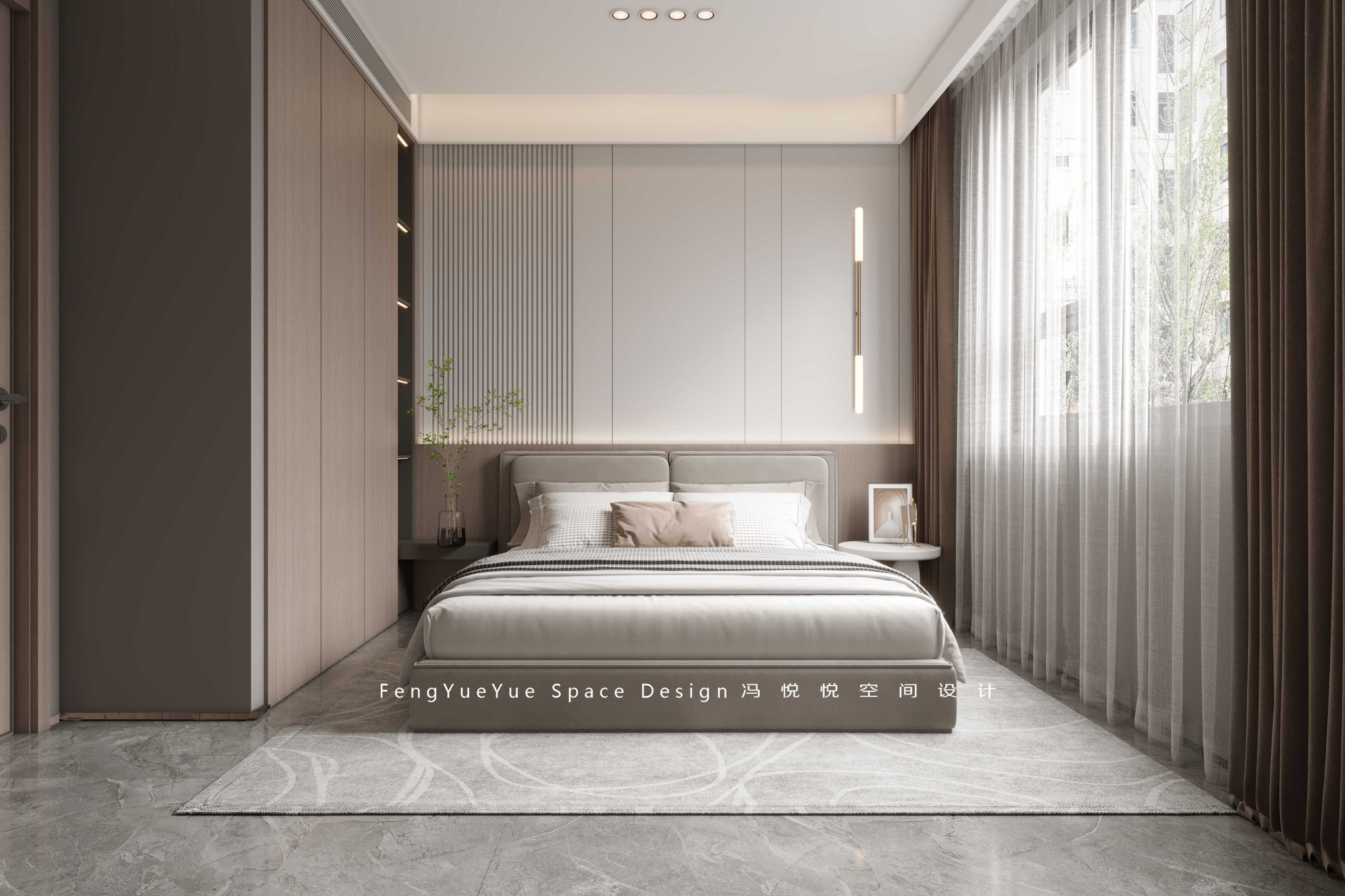 主臥木質背景墻的設計是主臥的一個亮點,讓臥室看上去更加高級,也更加時尚。床頭的小臺燈起到很好的裝飾作用,增加了臥室的色彩對比,使空間的色彩更加協調豐滿。